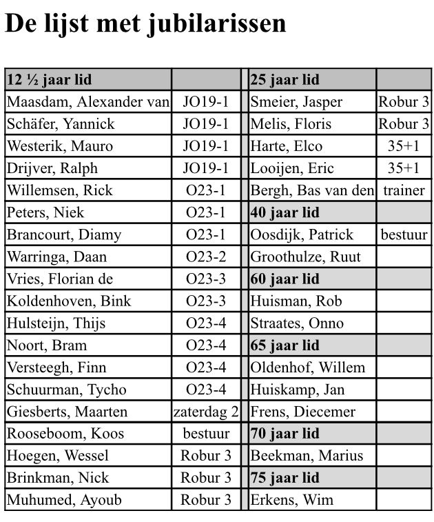 Iedereen is welkom om aanwezig te zijn bij deze huldiging en de viering van de 143ste verjaardag van onze vereniging. De leden die 12 ½ jaar lid zijn, krijgen de jubileumspeld per team aangeboden. De overige jubilarissen worden persoonlijk toegesproken. Dat blijkt ieder jaar een groot succes te zijn met mooie verhalen van enkele jaren geleden tot verhalen die terug gaan tot ver in de vorige eeuw. Verhalen die passen in het rijke verleden van Robur et Velocitas.